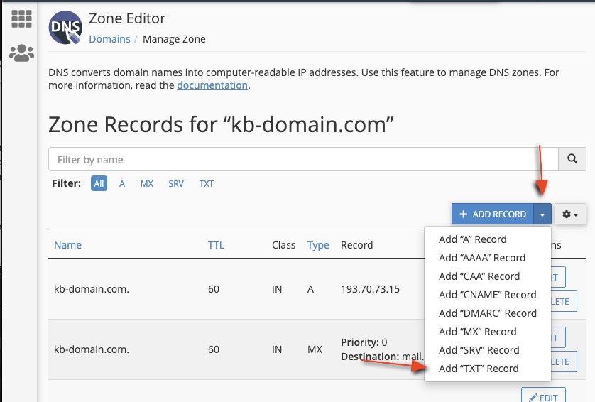 And add a new TXT record by clicking the arrow next to Add Record, and select Add "TXT" Record: