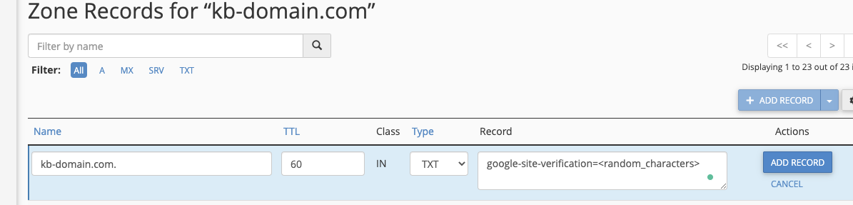 Google will ask you to add a TXT record to your domain, such as: