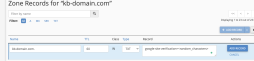Now you'd want to enter your domain into the Name field, leave TTL the default, ensure Type is set to TXT and in the Record textarea you'd define your google-site-verification string above, as follows: